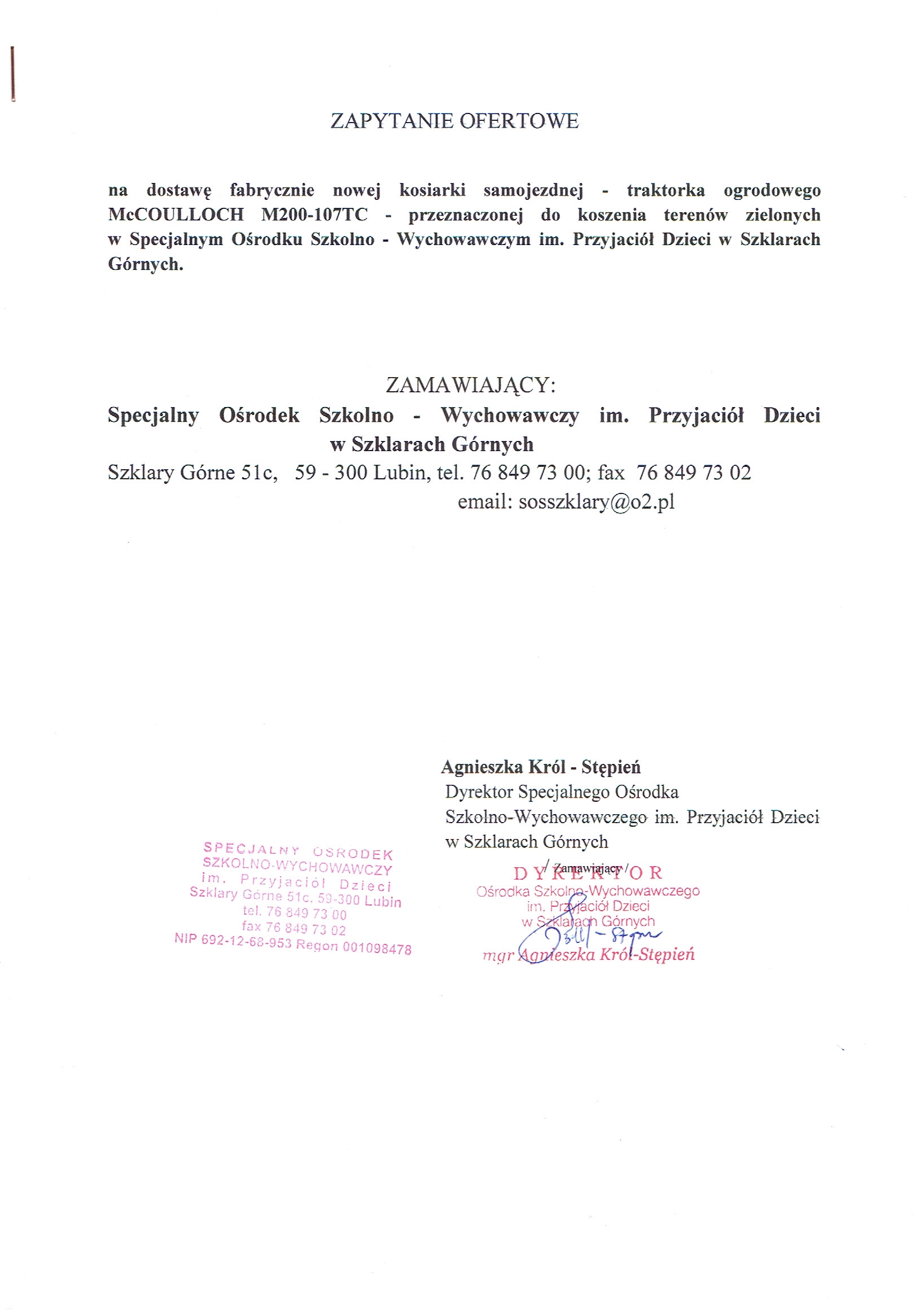 ZAPYTANIE OFERTOWE na dostawę fabrycznie nowej kosiarki samojezdnej - traktorka ogrodowego McCOULLOCH M200-107TC - przeznaczonej do koszenia terenów zielonych w Specjalnym Ośrodku Szkolno - Wychowawczym im. Przyjaciół Dzieci w Szklarach Górnych.
